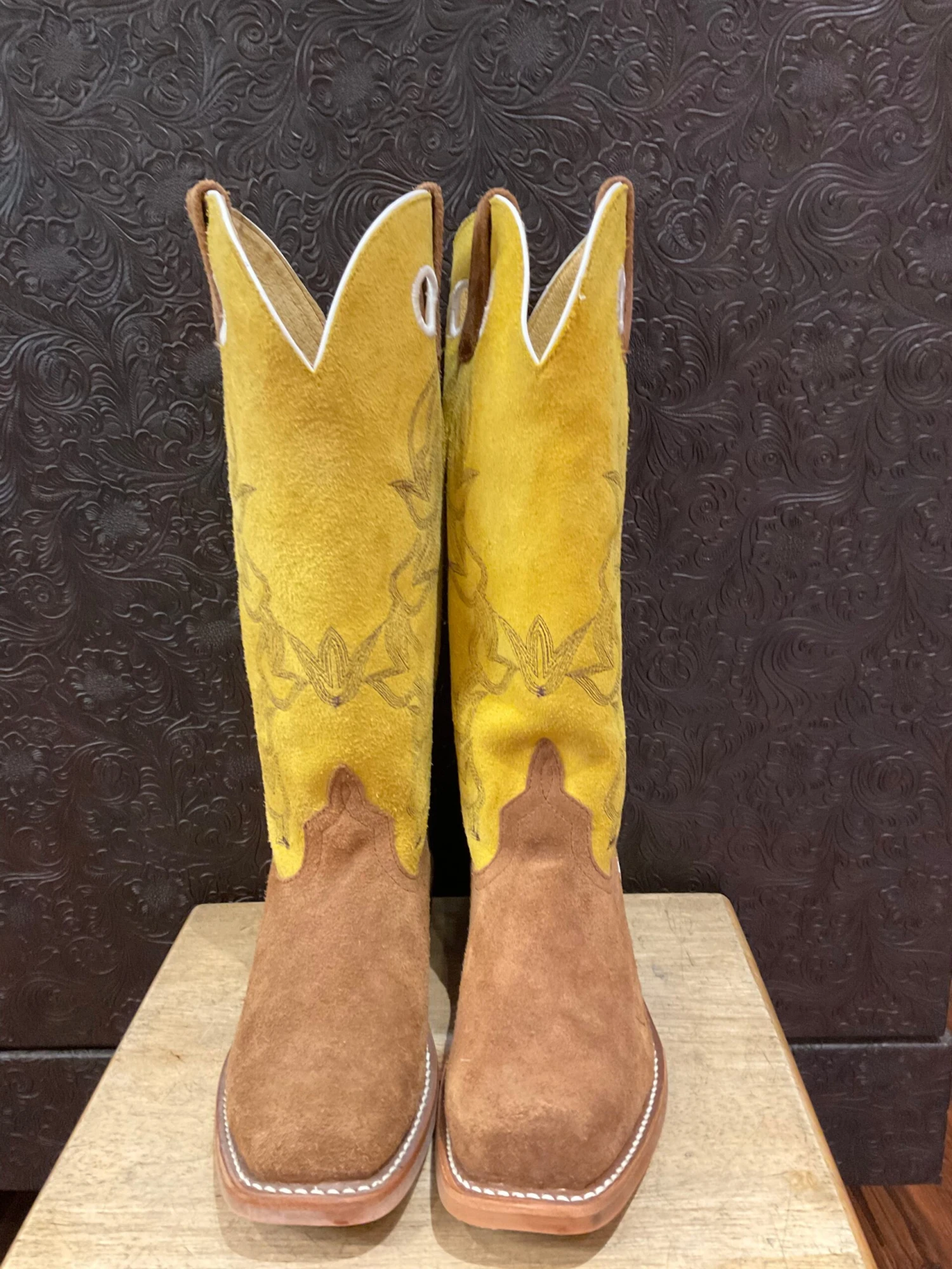 One of a kind mustard top Anderson Bean boot consists of a velvet-like leather on the shaft and vamp of boot. Beautiful for any cowgirl or cowboy to rock.