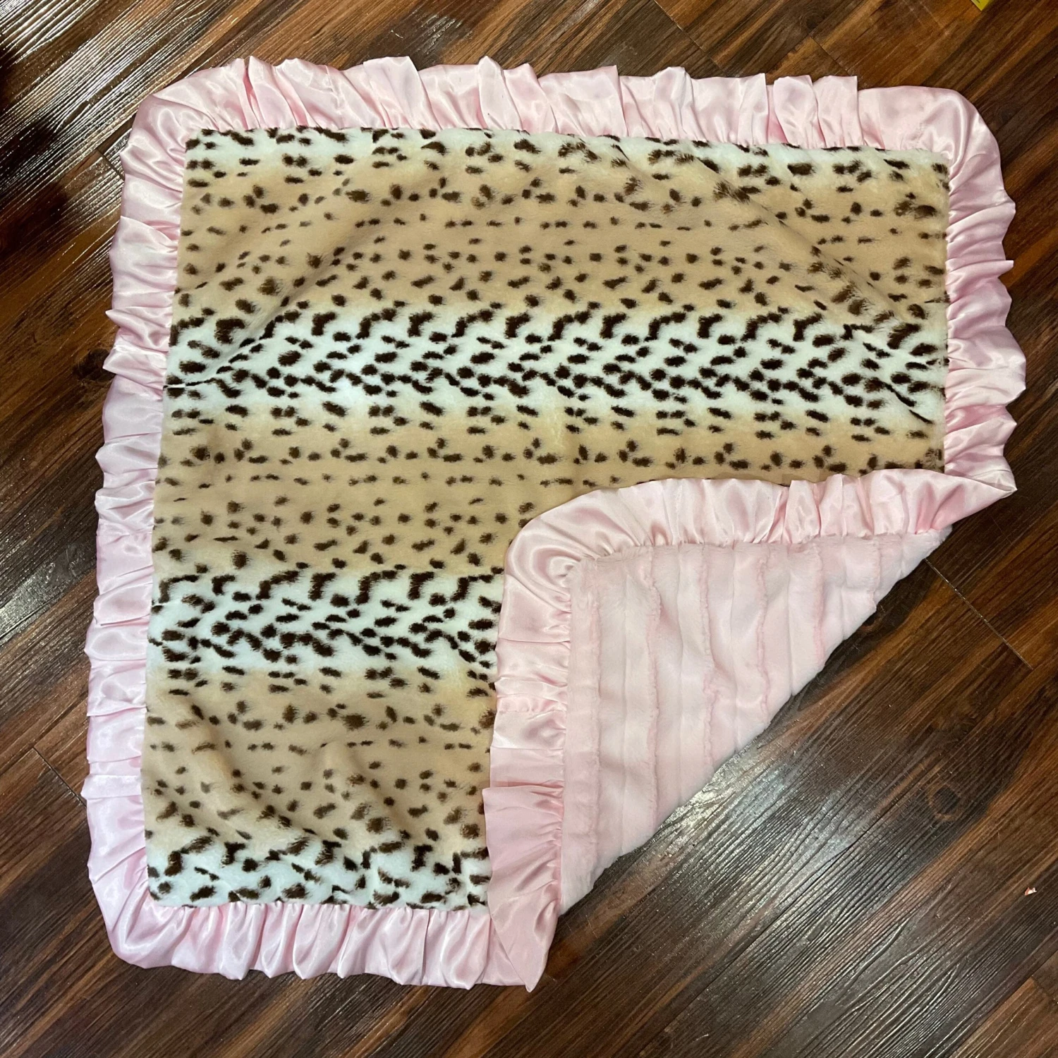 Stay warm and cute! Cheetah print on the front and pink on the back with a beautiful silky pink ruffled material along the border.