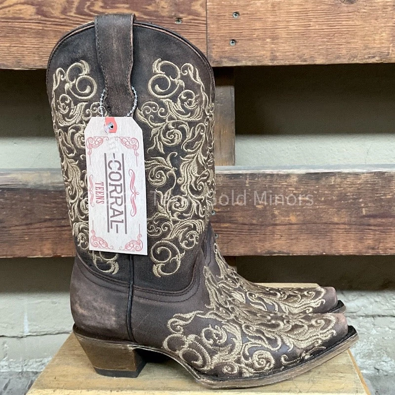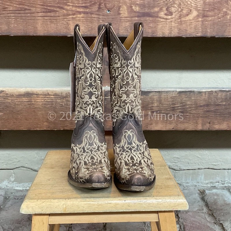 These Corral Boots are hand made leather with a unique vintage distressed look. This lends the boot a one of a kind appeal. They have leather pull up straps for your convenience. They feature a beautiful detailed Western stitching pattern throughout the entire boot.