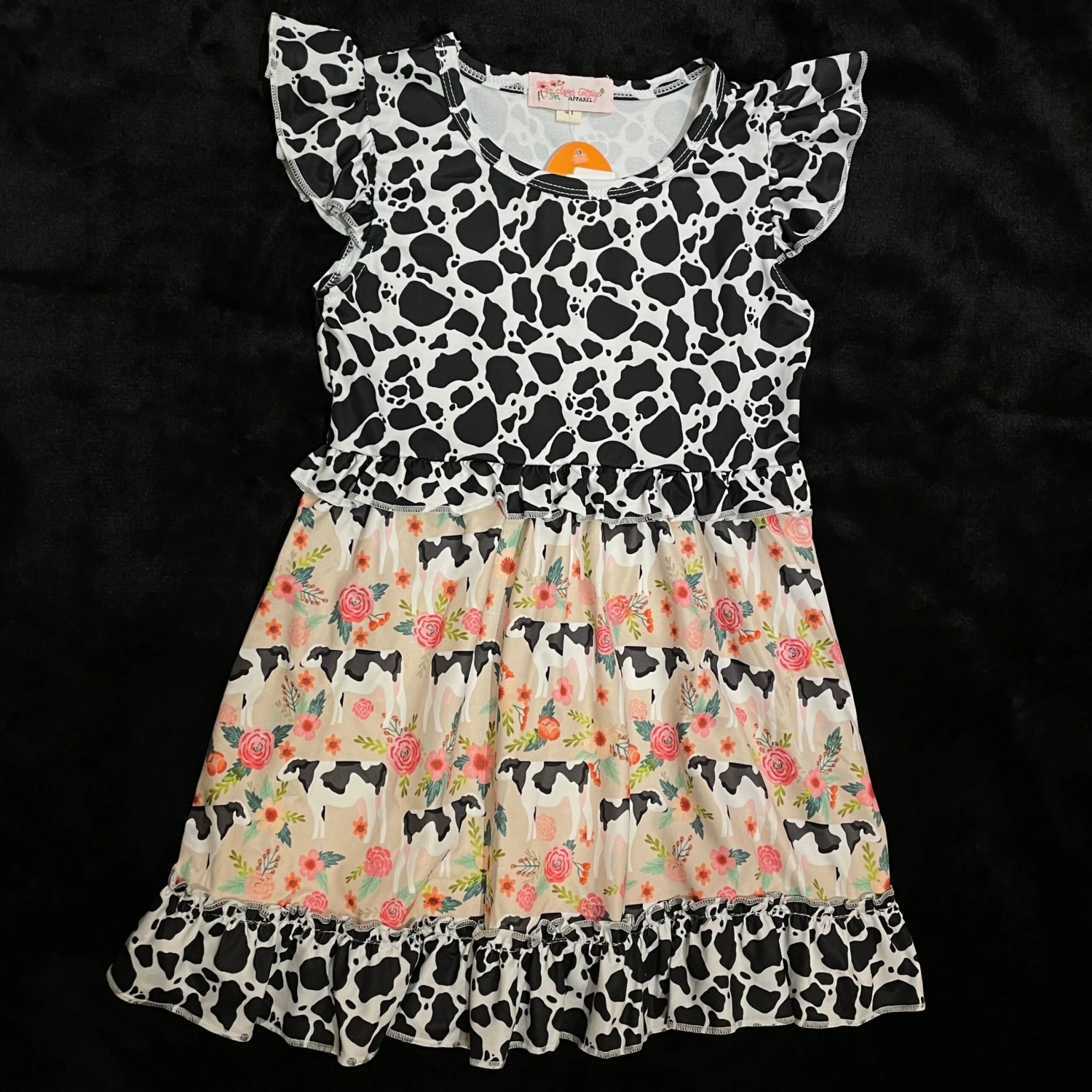 The attention to detail on this dress is superb. The cow print top and cow flower design on the bottom seamlessly blend well with each other. Plus, it is made with a cute ruffle trim on the bottom, adding a stylish touch.