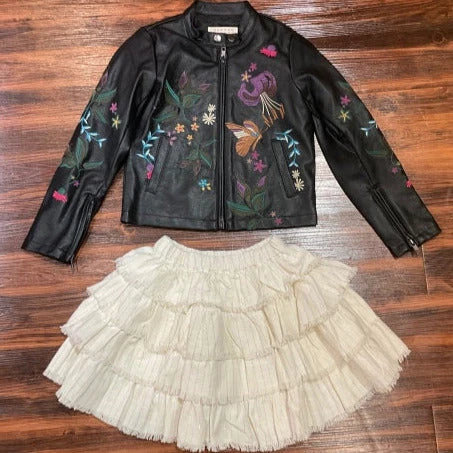 Style this beautiful black faux leather jacket. Eye catching & colorful designs. Consisting of detailed embroidery throughout the front, sleeve and back.