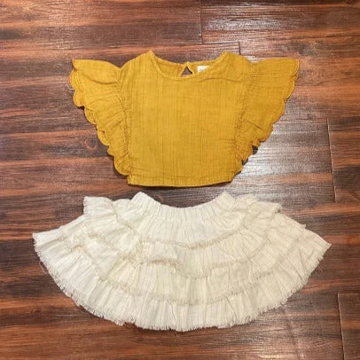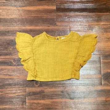 Cute mustard color blouse, with beautiful frill on each side of the shirt. Consisting of a soft ruffled fabric that compliments any outfit for any day.