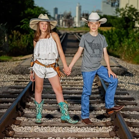 These holsters are hand made leather and have crystals around belt. Your little ones will LOVE these holsters. Includes guns