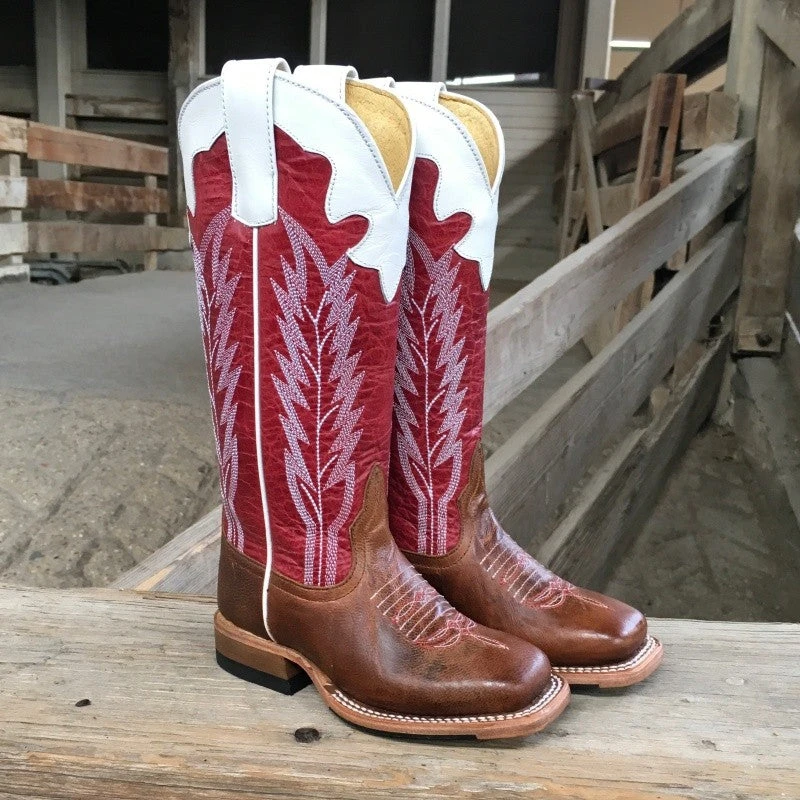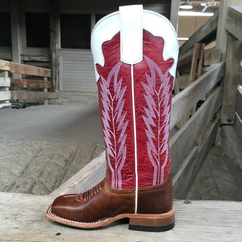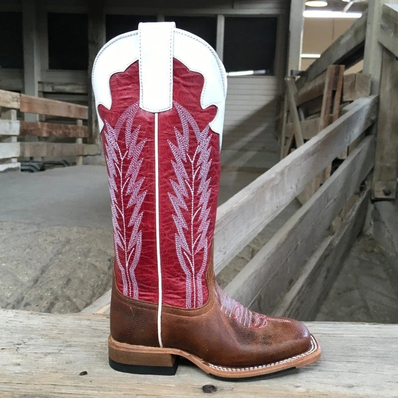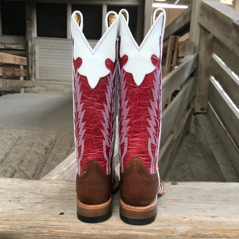 Classic square-toe Anderson Bean boot is hand made with 100% leather. This boot features a red shaft with white detailing and a brown vamp.