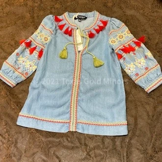 This adorable little dress is festive and fun! The material is so soft and colorful. It has beautiful details like sunflowers and colorful designs in greens, yellow and red tones. The tassels around the collar and sleeves are playful and chic! Pair this dress with Texas Gold Minor boots and a TGM Cowgirl hat!