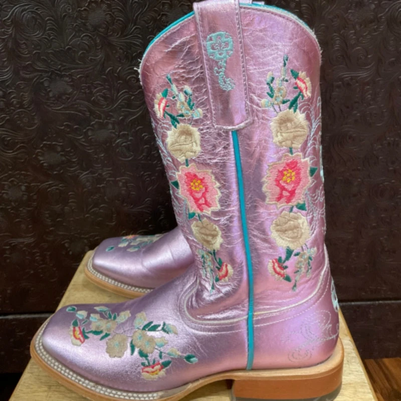 Beautiful metallic leather boot consists of a lavender color with a hint of pink and beautiful embroidered flowers throughout the boot including a turquoise piping.