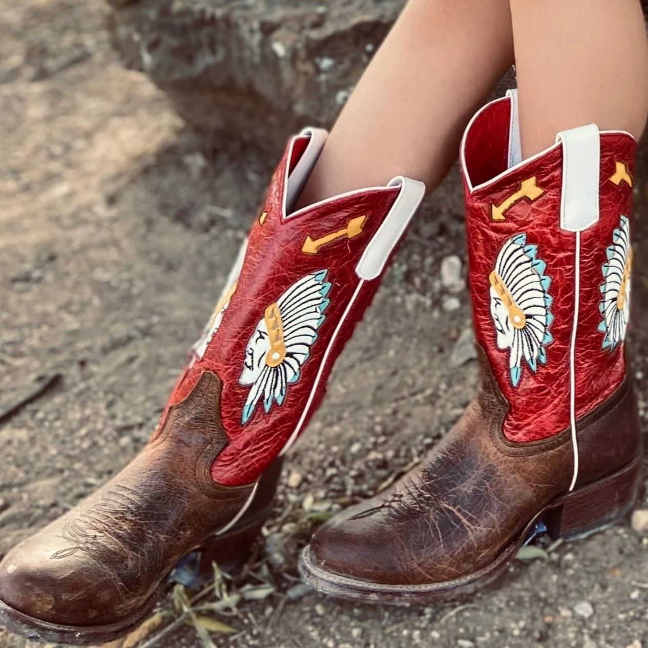 Macie Bean, Indian Chief MK5202 round-toe leather boot features a beautiful dark leather color with a vibrant red shaft.