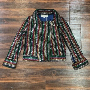 Beautiful eye catching jacket, consisting of stripped colorful sequence with a zipper throughout the side.