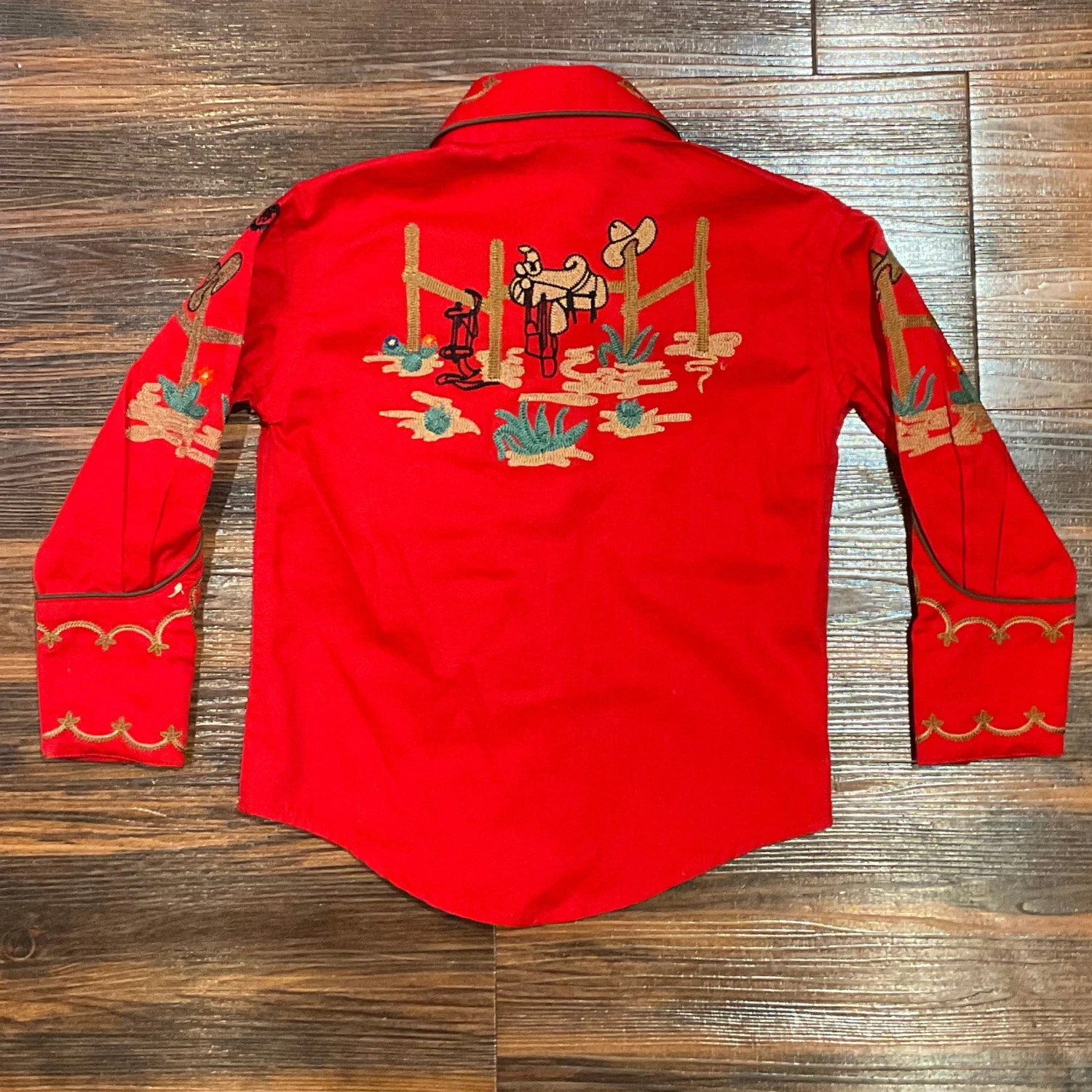 Check this (8842) Rockmount shirt out! Consisting of a beautiful red color throughout the entire shirt with unique embroidery on the collar, front, back and sleeves. Cant forget the amazing detailing like western figurines (Cactus, boots, saddles, cowboy hats) throughout the front top, top sleeves and back. With dark gold color buttons on the center and bottom sleeves.