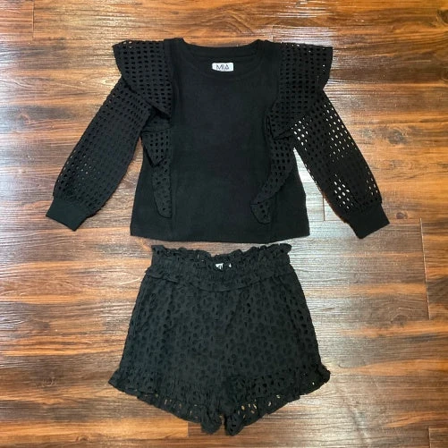 Beautiful black eyelet shorts consisting of a stretchy waistband with little ruffles up along the top perfect for your cowgirl at home.